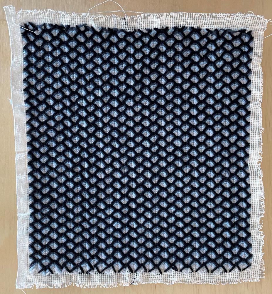 Púðaborð - Munstur 27x24 cm. Ullargarn í stramma. Hvítt, ljósgrátt, ljósblátt, koksgrátt og svart. Saumað með grenisting og/eða faldspori.