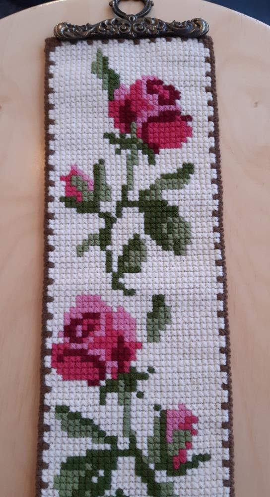 Klukkustrengur, saumaður með stórgerðum krosssaumi á hvítum grunni. Tvær rósir saumaðar eftir lengdinni. Brúnn kantur í kring. Sett upp með gráu fóðri. Járn fylgja.