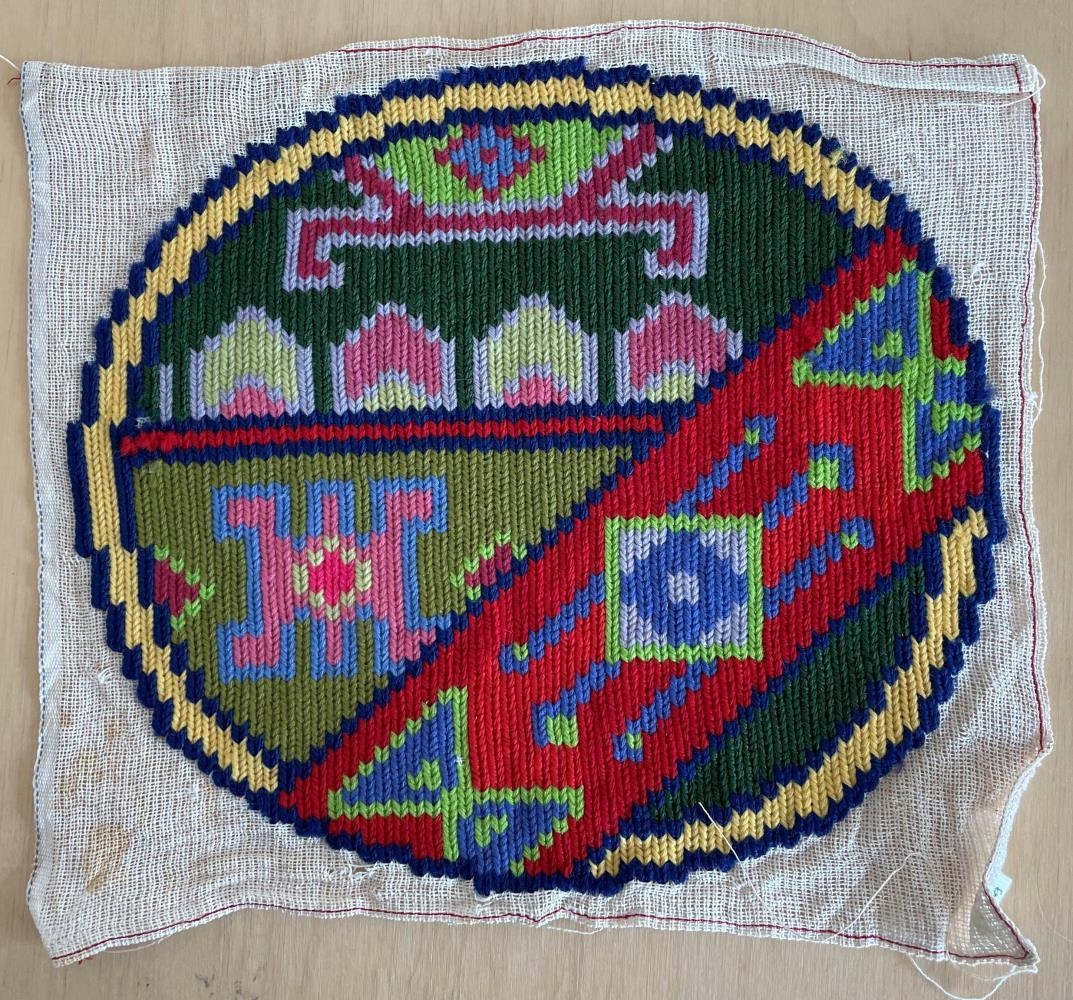Púðaborð. Munstur er kringlótt. Ullargarn í stramma. Munstur er abstrakt í skærum litum "Prjónasaumur".