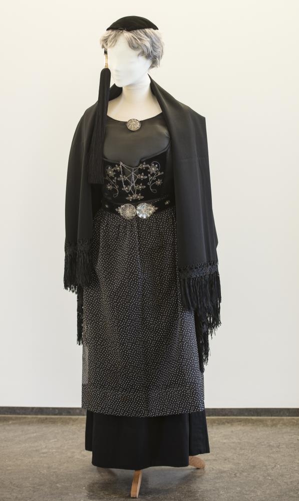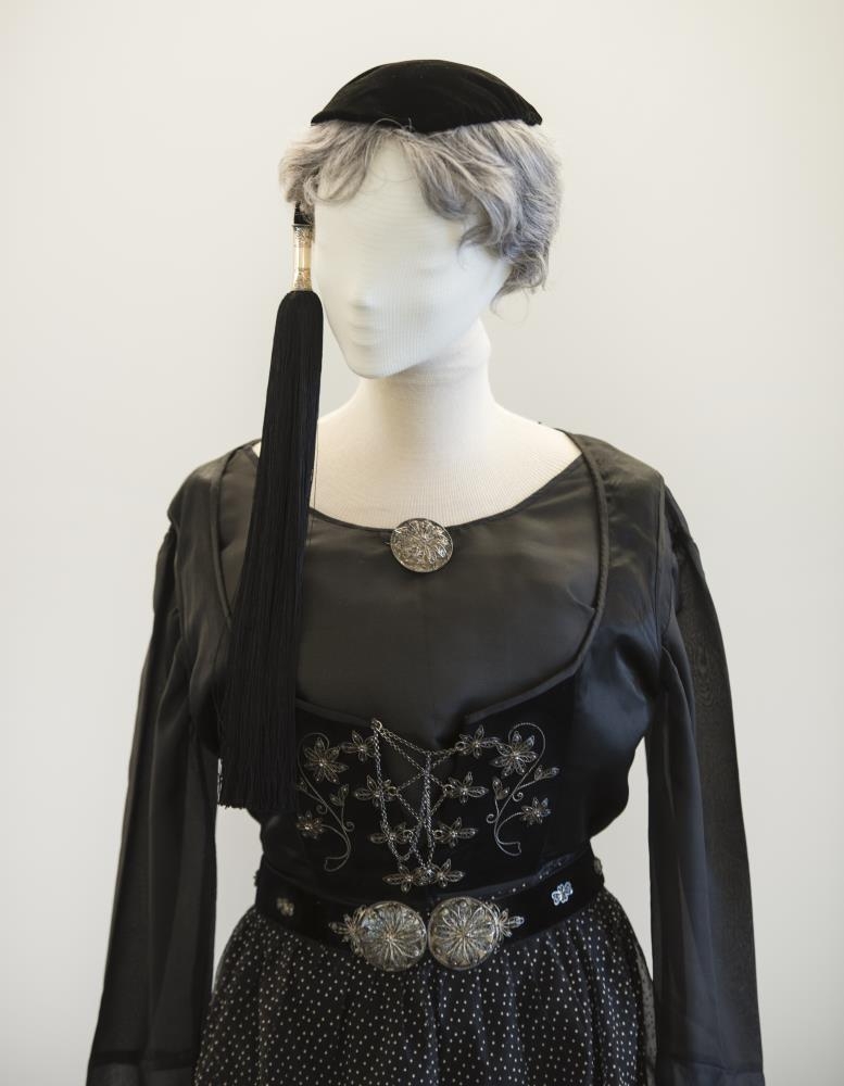 b - Skotthúfa úr fluaeli með silfurhóki og silkiskúf sem er um 40 cm langur.
