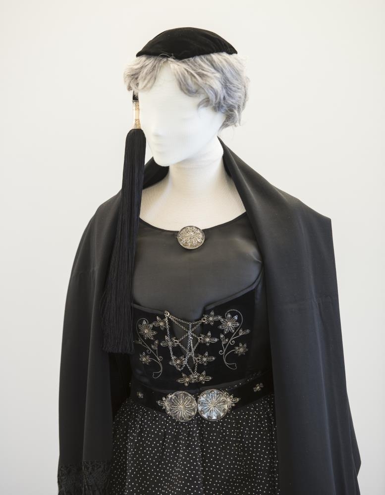 b - Skotthúfa úr fluaeli með silfurhóki og silkiskúf sem er um 40 cm langur.