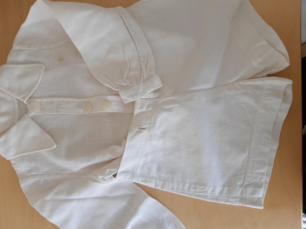 Drengjaföt. Skyrta úr hvítu bómullarefni. Skyrtan er langerma og hneppt að framan. Buxurnar eru stuttar úr pokalérefti með fjórum hnappagötum og hafa síðan hneppst upp á skyrtuna.