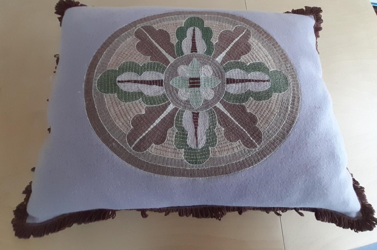 Púði - Ljósrauðbrúnn grunnur. Refilsaumur í munstri m. ullarbandi og silki. Ullarbandið er í 4 brúnum litum, einum ljósum og 2 grænum. Silkið í gulum, brúnum, grænum og bleikum. Munstrið er saumað á léreft sem síðan er saumað niður í sjálft sessuborðið. Brúnt kögur.
