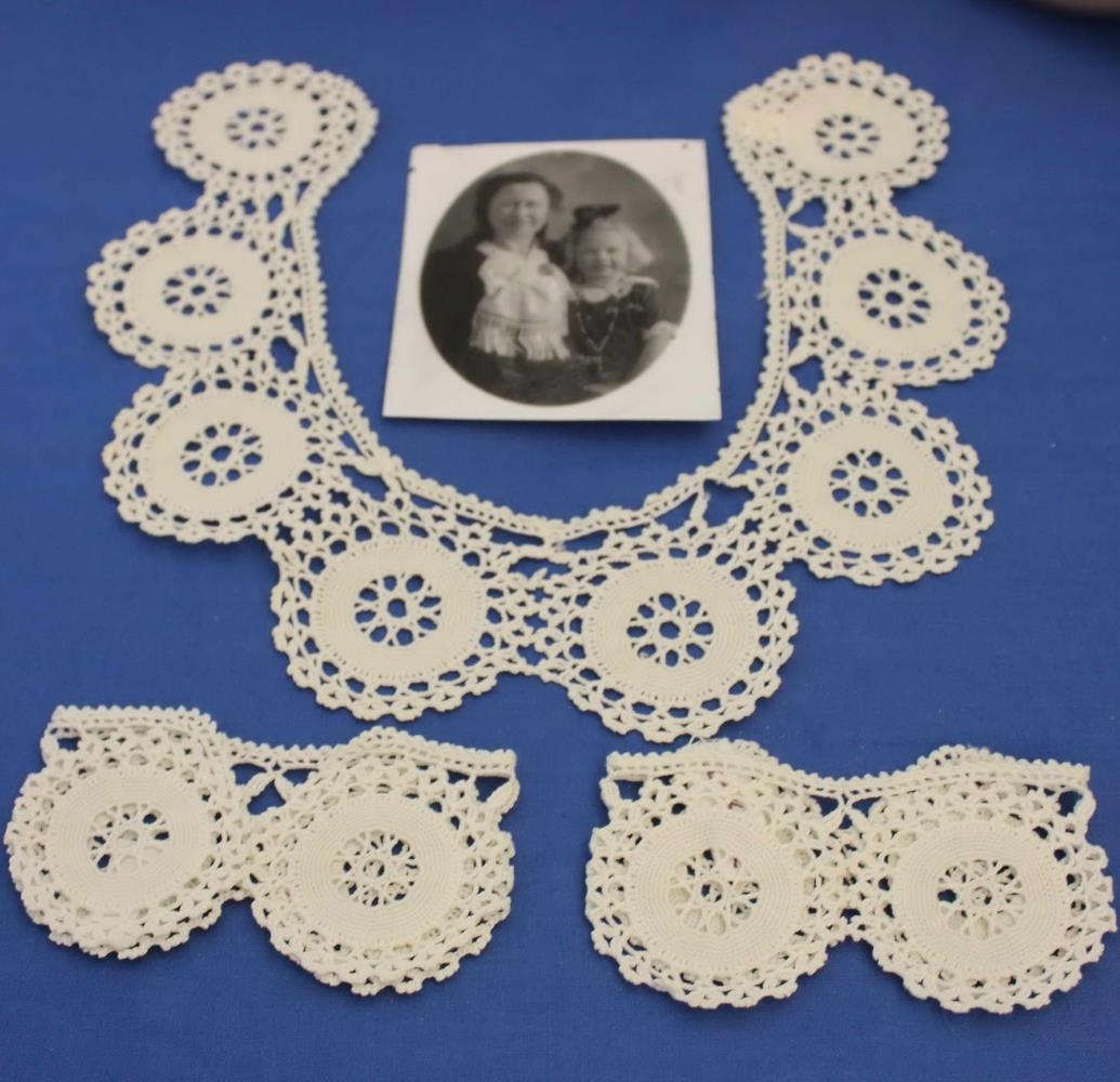 Barnakragi, uppslög og mynd a,b,c – Barnakragi og uppslög, hekluð úr fínu heklugarni. Átta dúllur í kraganum og fjórar í hvoru uppslagi. Myndin var í eigu Þorbjargar Andrésdóttur, frá Síðumúla og er af systurdóttur hennar og Inigbjörgu móður hennar. Kraginn og uppslögin eru hekluð af Þorbjörgu Guðmundsdóttur (1885-1920) frá Mjóadal, A-Hún. Annað uppslagið glataðist en fannst síðar og var afhent safninu 6. júlí ári 2000.