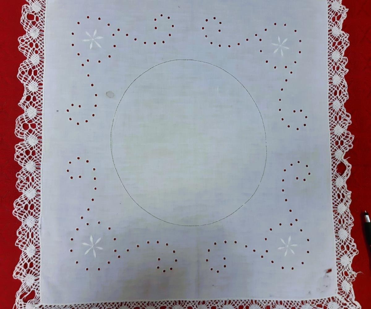 Ljósadúkur úr hvítu hörlérefti, með keyptri blúndu. Allt í litlum hullgötum og stjörnum. Allt gert í vél.