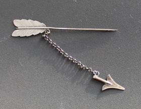 E. Laufaprjónn. Gylt silfur. L:17 cm. Hnúður á enda á prjóninum, stórt lauf með kroti, hjartalaga lauf á hinum endanum, festi á milli.