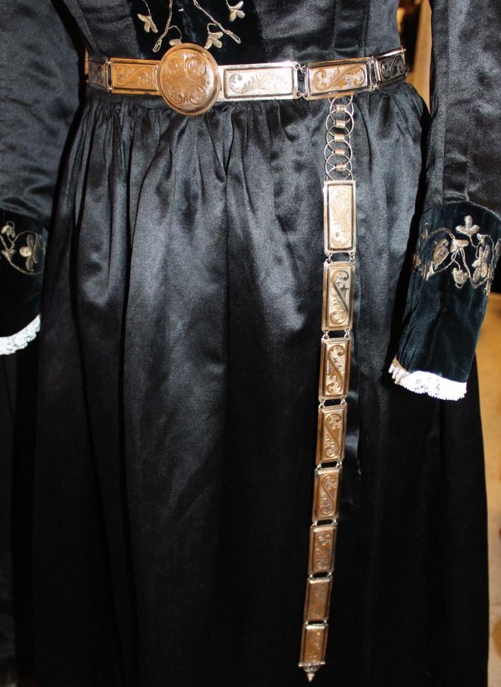 Saga: F. Spöng. H:5 cm. Gylt silfur. Upphleyptur 2 cm kantur að neðan með munstri. G. Sprotabelti. Gylt silfur. L:89 cm. Sproti 56 cm. Framan á beltinu er skjöldur 5x5 cm. 14 stokkar festir saman með lykkjum. Sproti 5 hringir í lykkju með 5 sívalingum, 8 stokkar, sproti neðst. Merki á bakhlið JÓN 828, sem mun vera Jón Sigmundsson gullsmiður Laugavegi 5. H. Mynd af Sigurlaugu í Skautbúningnum. Ljósmyndari Jón Dahlmann. Búningurinn kom í safnið sept. 1993. Sigurlaug saumaði búninginn í kvennaskólanum á Ytri-Ey. Hún var þar 1886, 1889, 1890. Foreldrar hennar voru Indriði Jónsson bóndi á Ytri-Ey og Súsanna Jóhannsdóttir frá Holtastöðum. Sigurlaug giftist Jónasi Jóhannssyni frá Vindhæli, bjuggu þau í áraraðir í Bárunni í Reykjavík (þau systkynabörn). Sigurlaug var í þessum búning þegar hún var áttræð og fermd tvö barnabörn hennar. Sigurlaug var mikil handavinnukona og saumaði sjálf þennan forláta búning sem er afhendur á þetta safn til varðveislu frá barnabörnum hennar. Bræðurnir Raymond og Hubert gerðu sér ferð til Íslands 1994 og færðu safninu beltið sem fylgdi búningnum.