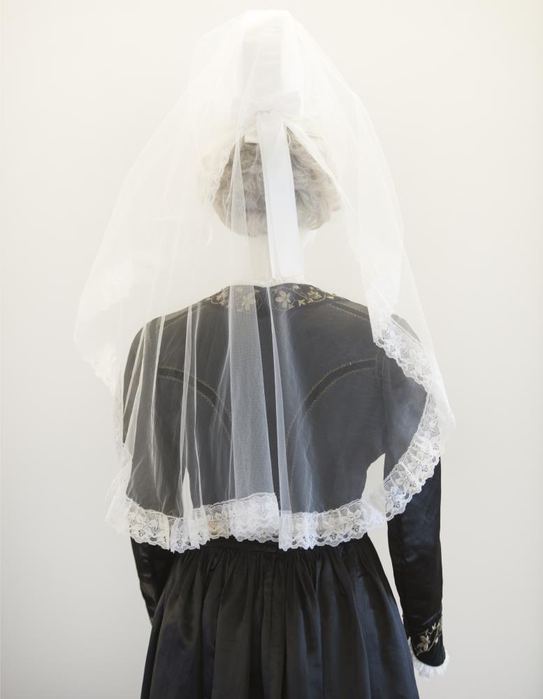 C. Blæja. S:120 cm. Efni er nælon með 2,5 cm blúndu utan með (nýtt). D. Peysufatabrjóst úr lérefti með 9 cm blúndu á miðju.