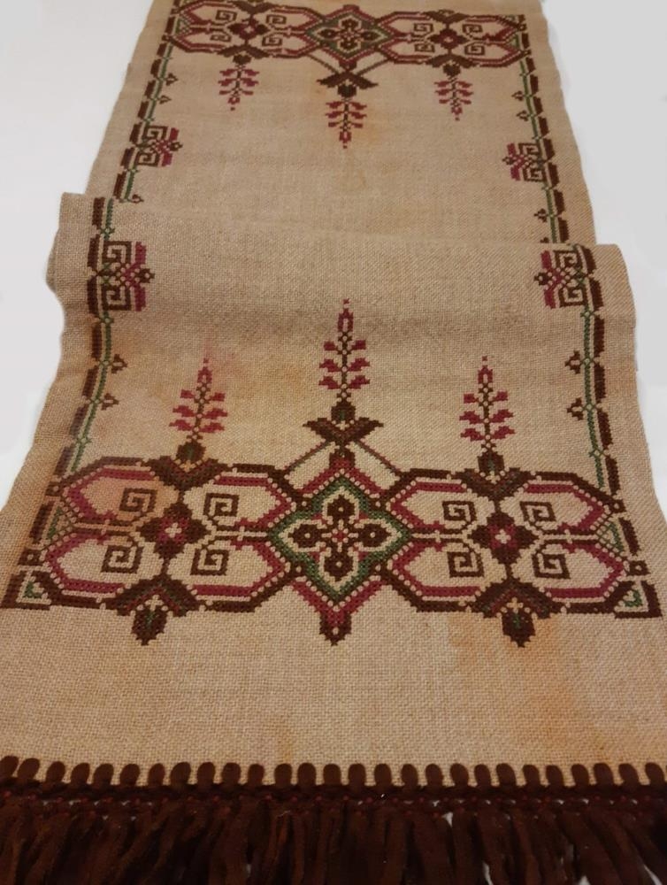 Borðrenningur. Efnið er drapplitaður ullarjafi, útsaumur með ullargarni, í brúnum, bleikum og grænum litum. Kögur, brúnt.