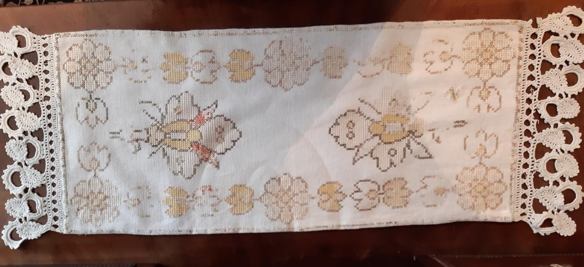 Löber útsaumaður m/fínu garni í gróft strammaefni. Til endanna er 9 cm breið blúnda,