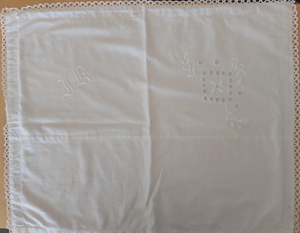 Svæfilsver - Hvítt léreft. Saumað í vinstra horn stafirnir IK. Í hægra horni er enskt franskt munstur. Orkeruð blúnda í kring um þrjár hliðar. 3 hnappagöt í opi. Saumað í búið fyrir giftingu 1950.
