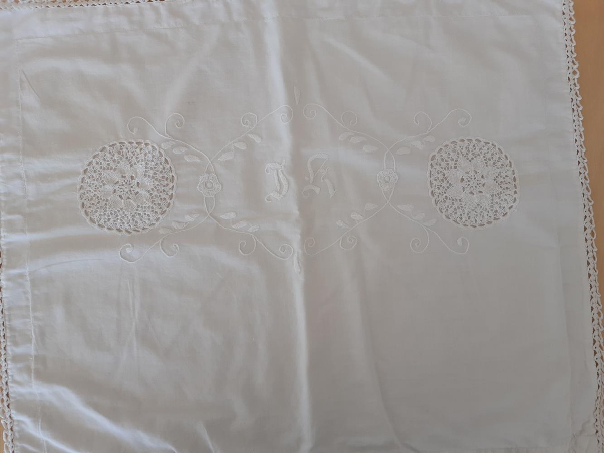 Svæfilsver úr hvítu lérefti. 2 prjónaðar dúllur sitt hvoru megin á verinu. Útsaumað blómsturbekkur um alla miðjuna. Þar í miðju stendur I.K. Smá hekluð blúnda á þrjár hliðar. 3 tölur (tau) í opi og hnappagöt. Saumað í búið fyrir giftingu 1950.