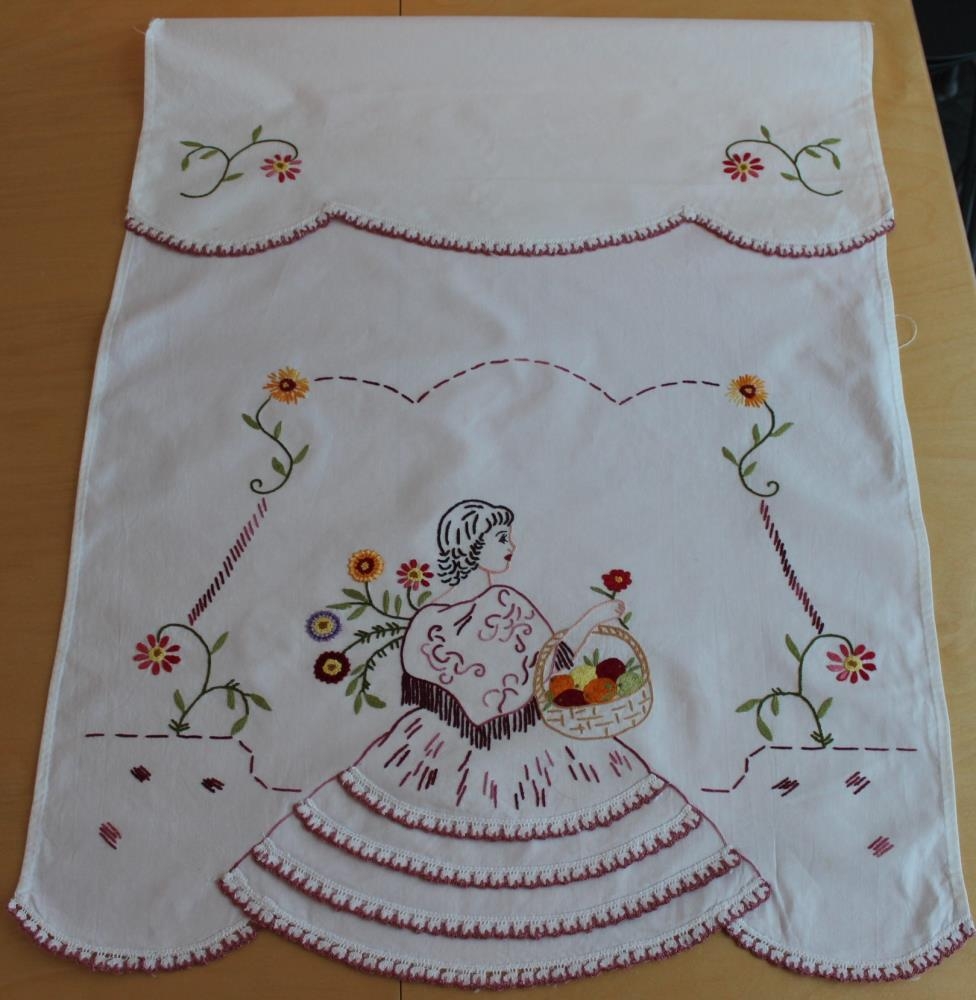 Eldhúshandklæði/puntuhandklæði úr hvítu lérefti. Útsaumuð stúlka og heklaðar blúndur mynda pils. Saumað út m/lykkjuspori og fleiri sporum. Ýmsir litir. Saumað 1980.