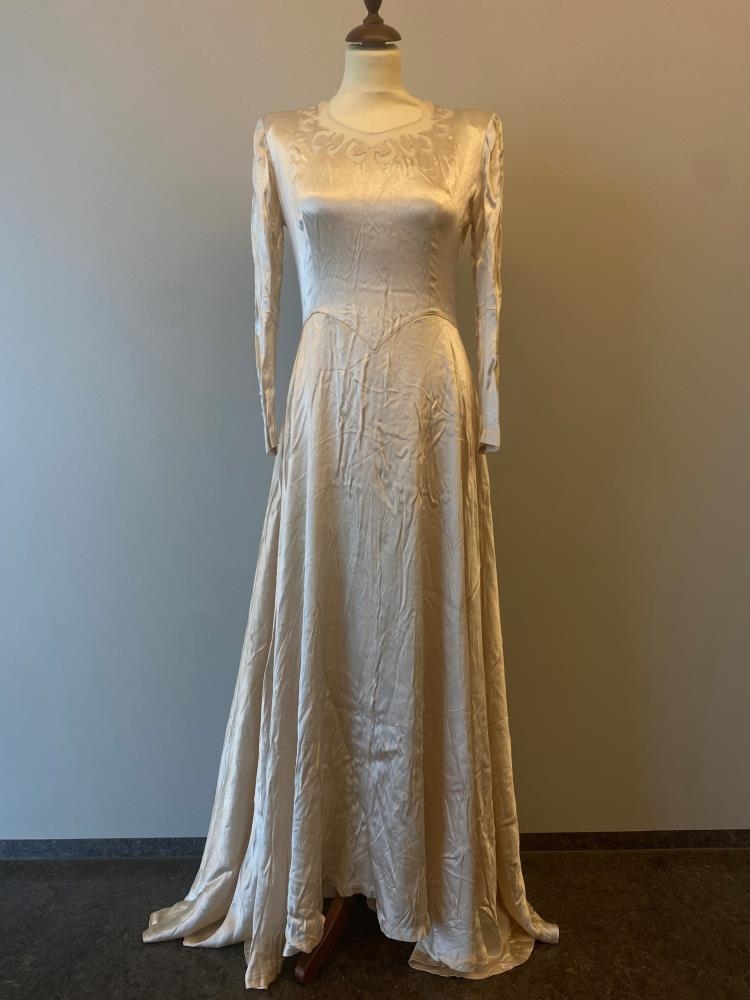 Brúðarkjóll úr silki, satínofinn, síður m/mörgum hnöppum, yfirdekktum, bæði á ermalíningu og baki.