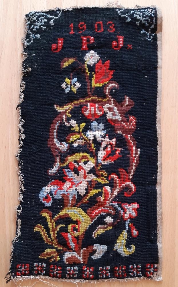 Prufustykki saumað með krosssaumi. Grunnur svartur. Ýmiss konar blaða- og blómamynstur í ýmsum litum. Saumað með rauðum liti "1903 JPJ" Saga: Tveir miðar fylgdu: 1. Jón Pálmi Jensson(Jónsson) frá Gunnfríðarstöðum saumaði þetta á æskudögum. 2. Þetta sendi ekkja Jóns Pálma frá Gunnfríðarstöðum til mín í sumar. Hún er orðin gömul en vill koma þessu þangað sem er réttara (erfitt að lesa). Kær kveðja Helga Jónsdóttir Hofteigi 18