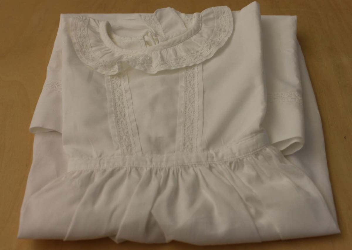 Lauertkjóll úr undurfínu bómullarlérefti (silkilérefti). Blúndur neðan á skjörti, framan á ermum, tvær á brjósti og ein ofan á kraga. Kjóllinn tekin saman við háls og í mitti. - Saga: Saumaður áður en Gunnhildur fæddist 17.10.´45 af móður hennar, Unni Þórðardóttur. Sjá bláu möppu