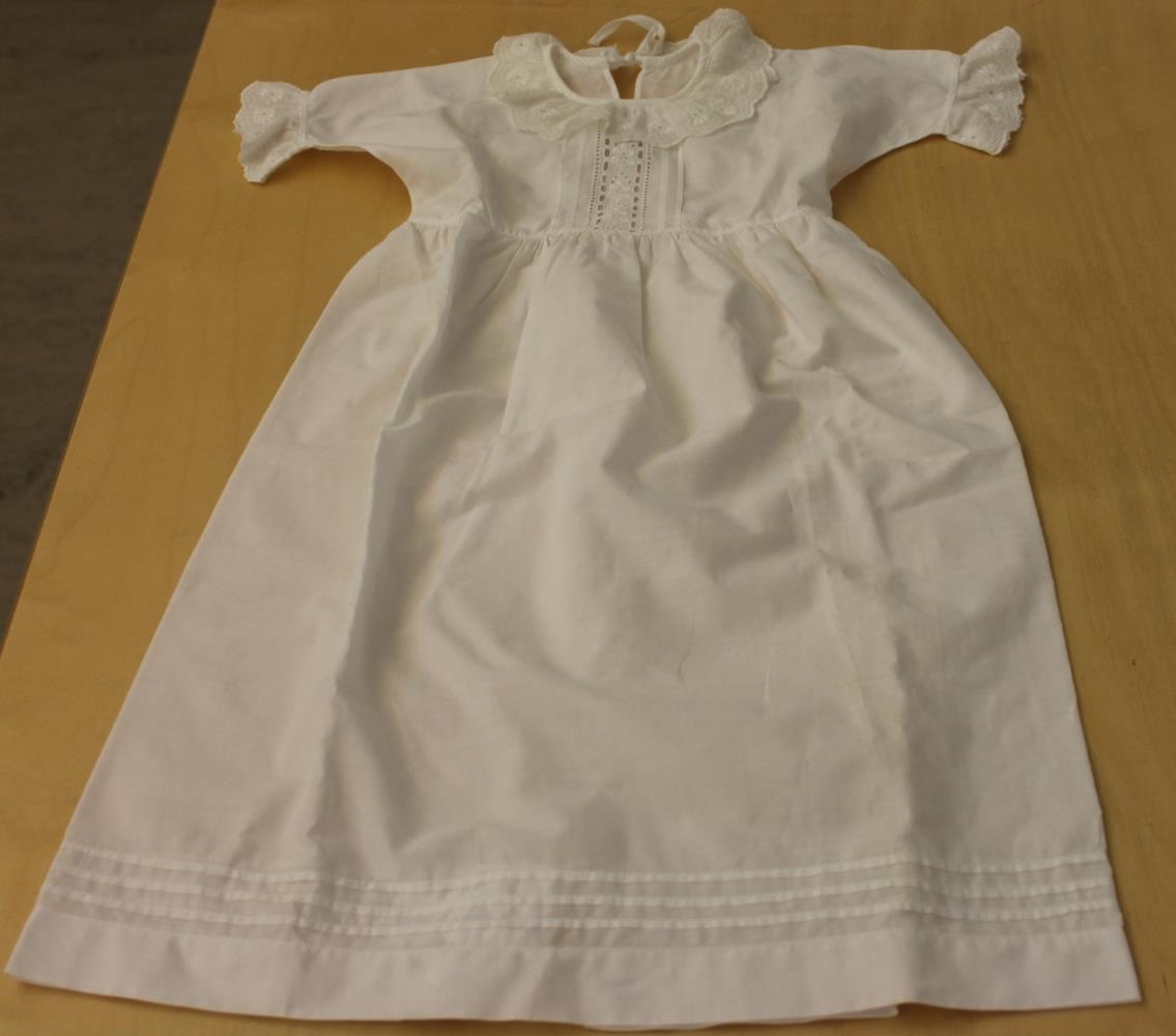 Lauertskjóll - Lauertskjóll úr undurfínu bómullarlérefti (silkilérefti). Þrjú leg að neðan á skjörti. Blúnda fyrir miðju brjósti og tvö leg sitt hvoru megin. Kraginn er blúnduefni. Blúnda framan á ermum. Tekin saman með tölu í mitti og bundin við háls - Saga: Saumaður áður en Gunnhildur fæddist 1945 af móður hennar Unni (1922-2006). Sjá bláu möppu
