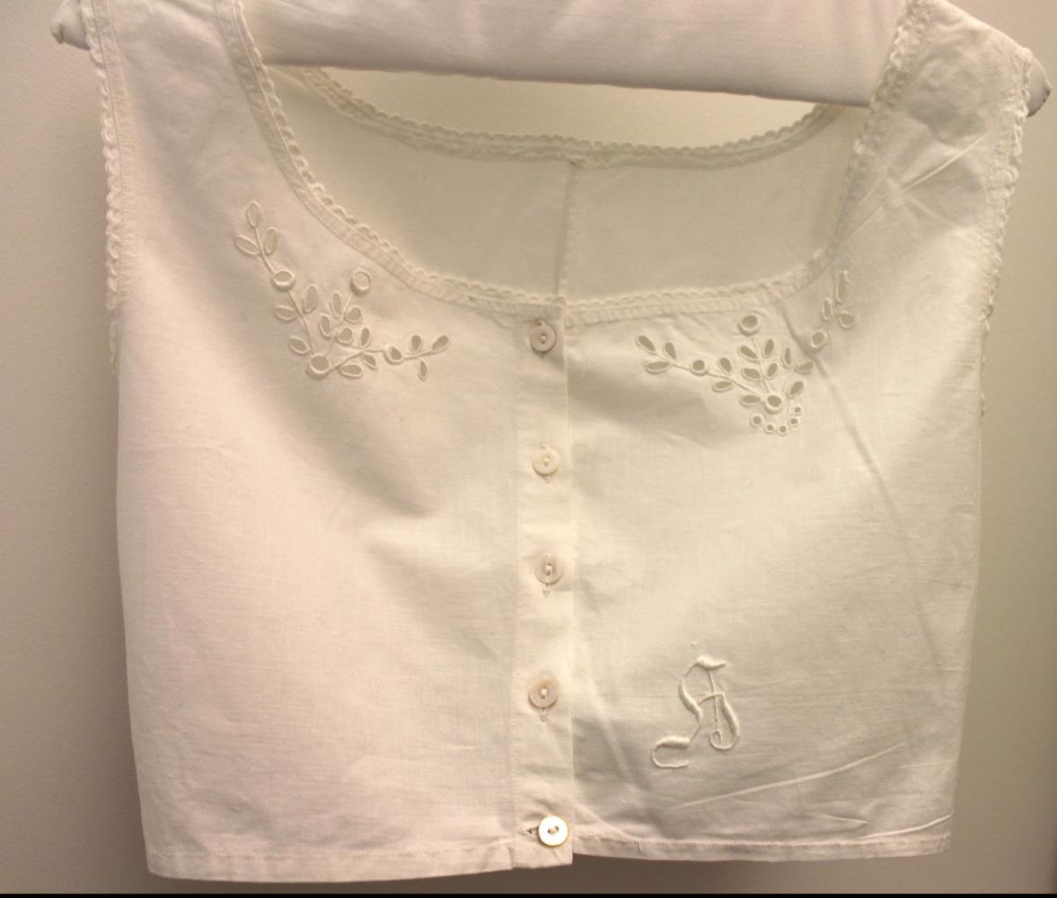 Kot - Kot úr hvítu lérefti. Blúndur í handvegi og hálsmáli. Útsaumað með blómamynstri á hvorum boðung,með enskum saum . Fimm tölur að framan og staurinn H saumaður út með frönskum saum. - Saga: Haraldína, alltaf kölluð Helga, var afasystir Þórhildar. Haraldína Helga Sigurðardóttir var fædd 27. Sept. 1891 í Reykjavík. Vinnukona í Reykjavík 1910. Húsfreyja á Framnesvegi 10a, Reykjavík 1930. Húsfreyja í Rvík 1945. Gift Sigurði Jónssyni, 1880-1964. Þau eignuðust ekki börn. Frekari upplýsingar í fylgiriti 2337. Haraldína Helga Sigurðardóttir (1891-1985)