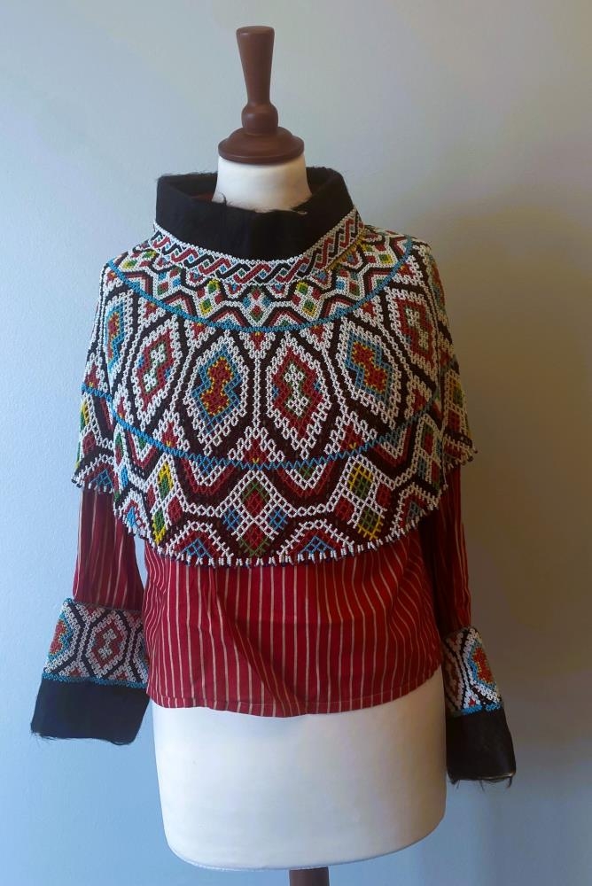 Treyja - sparitreyja með miklum skrautbekk. Skyrtan er úr bómullar efni rauðu með hvítum langröndum. Bekkurinn er festur undir hálsmál og er annars laus. Litir Hvítur, rauður, grænn, gulur, ljósblár, dökkblár í perlum. Hálsmálið er skinnkantur 7sm trúlega sauðnautsskinn. Þar sem hálsmál og perlubekkurinn mætast er perluborði saumaður yfir. Hann myndar hlaupandi munstur. Framan á ermum er áþekkur frágangur þ.e. loðið skinn 6sm kantur og perlukantur fyrir ofan 8sm. Mjög flott.