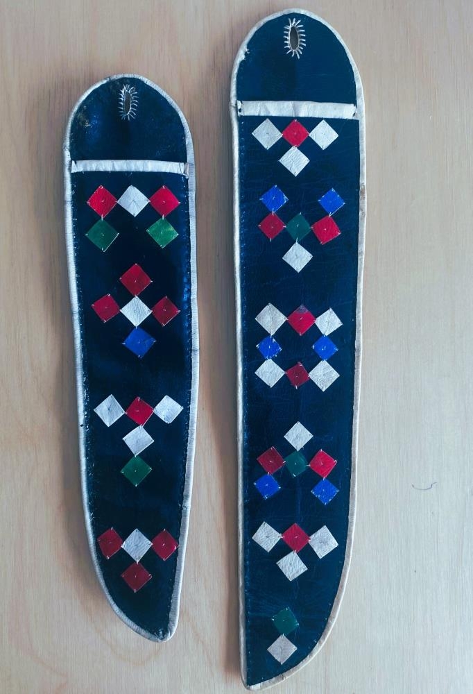 Slíður undir hnífa a og b - A. og B. Svart skinn. Briddað með hvítu skinni. Skreytt með útklipptum skinnreitum í hvítum, rauðum, grænum og bláum lit. Þeir mynda munstur niður eftir slíðrinu. Saumað hnappagat efst á slíðrinu.