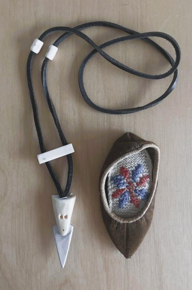 Hálsmen og lítill skinnskór - Skinnól og á hana er fest útskorið men úr hvalbeini. Í endann er hnífsblað fest neðan í menið. Ofar er eitt bein sem fest er í báðar ólarnar. Efst er lítil perla á sinn hvorri hliðinni. 2398 b - lítill skinnskór, sennilega úr selskinni. Skórinn er bryddaður með hvítri rönd og prjónaður illeppur inní. Skórinn kom síðar og ákveðið að setja hann á sama nr. aðskilinn með bókstafnum b. Efst á sólanum er lítil lykkja sem bendir til að skórinn hafi verið hengdur upp eða verið skraut á jakka/kápulafi, rétt eins og algengt var með litla íslenska skinnskó sem hafa í seinni tíð verið seldir sem minjagripir.