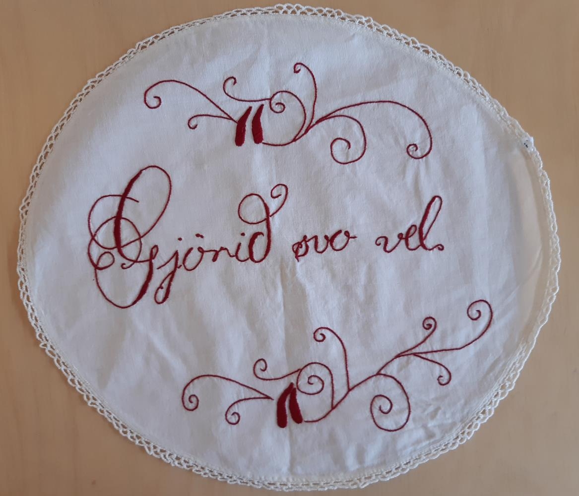 Lítil sporöskjulögu bakkaservíetta úr hvítu bómullarefni. Útsaumað með rauðum flatsaum og varplegg. Munstur – Í miðju stendur «Gjörðu svo vel» og greinar sem dreifast út bæði að ofanverðu og neðanverðu. Lítil hekluð blúnda í kring.