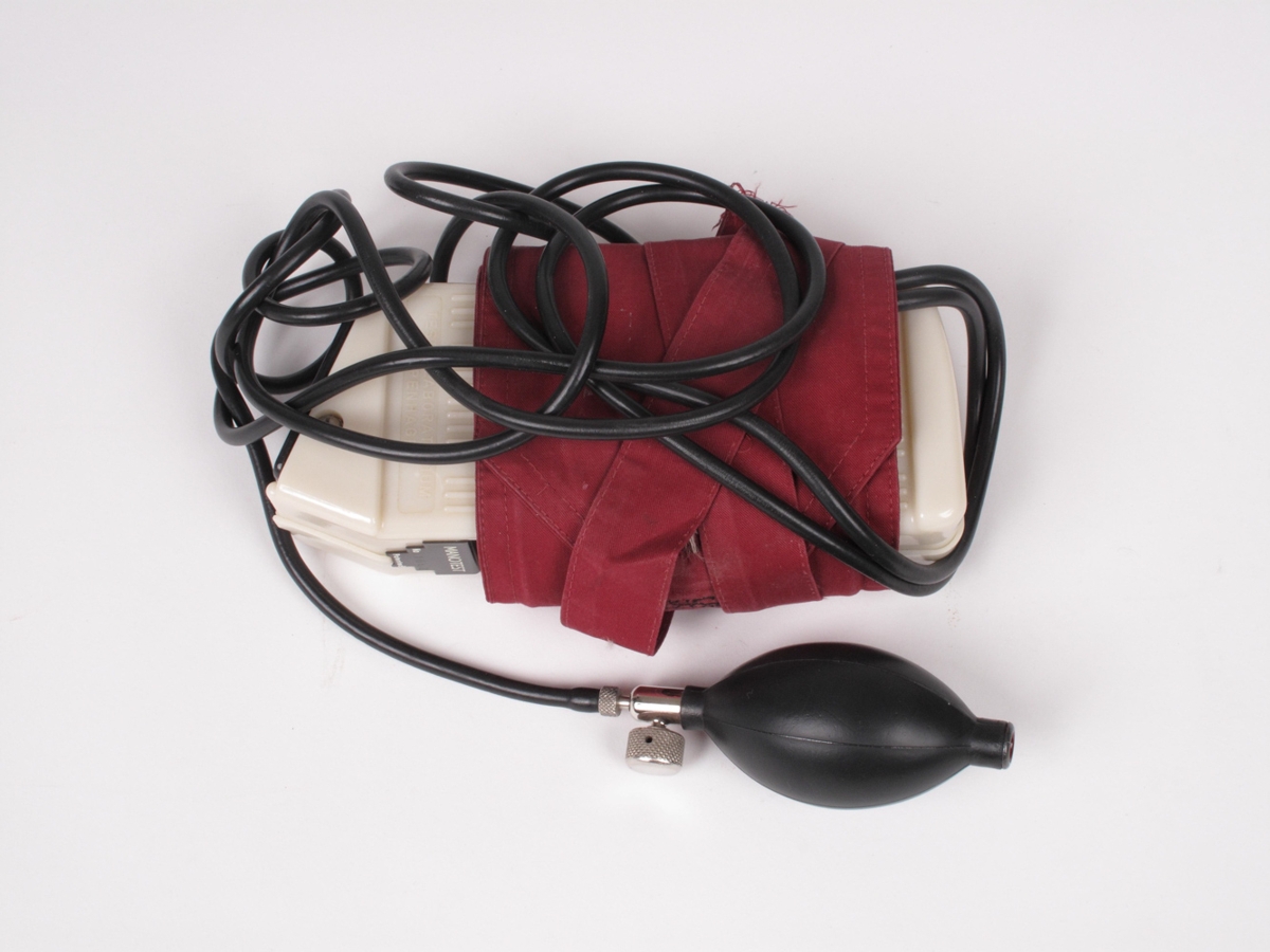 A: Blóðþrýstingsmælir MANOTEST TESTA-LABORATORIUM/ COPENHAGEN, í rauðri leðurtösku með rennilás, merki: NYROP, límt á takið. Það ónotað. B: Merkt: III/ Manotext, notað.