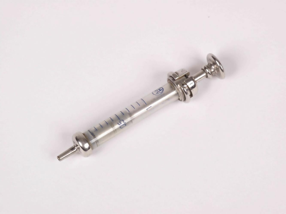 Rekord dæla úr gleri og málmi 0.1-1 ml, ómerkt á bulluhaus en á gleri: H. Ónotuð.