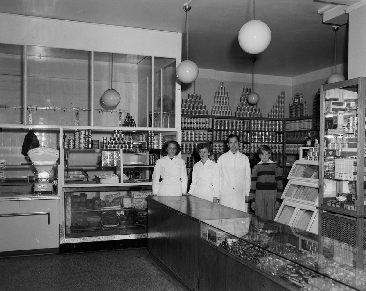 Kaupfélag Hafnarfjarðar. Strandgötu. Hafnarfirði. Innan úr matvöruverslun. Afgreiðslufólk í hvítum sloppum uppstillt innan við afgreiðsluborð ásamt dreng í peysu, líklega sendli. Glerborð með varningi, skápur með tóbaki, vigt, uppstilltar niðursuðuvörur. Haraldur Guðmundsson kaupfélagsstjóri. Heimild greiningarsýningin Hvar?Hver?Hvað? í Myndasal 2015.
