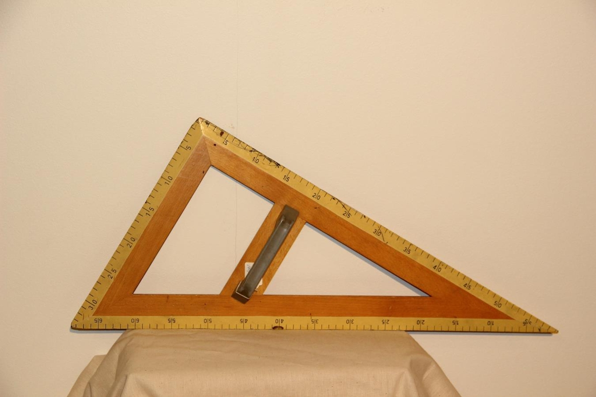 Kvarðinn er úr ljósri eik. Hann var notaður í sníðadeild Fataverksmiðjunnar Heklu á Akureyri.