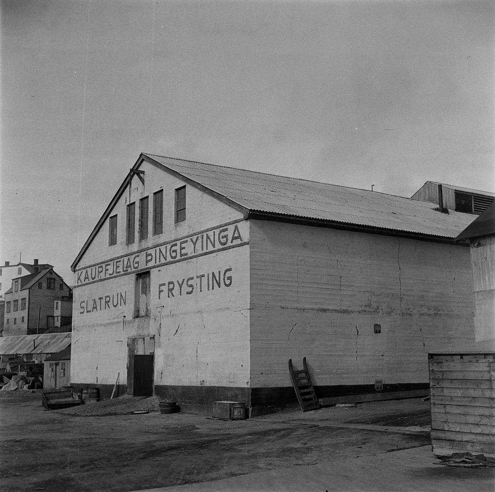 Húsavík. Stórt iðnaðarhús með ámálað á framhlið KAUPFÉLAG ÞINGEYINGA SLÁTRUN FRYSTING. Sér til annarra húsa. 1948. Tímasetning á þessari syrpu byggir á myndbirtingu í Tímanum 20. júlí 1948.