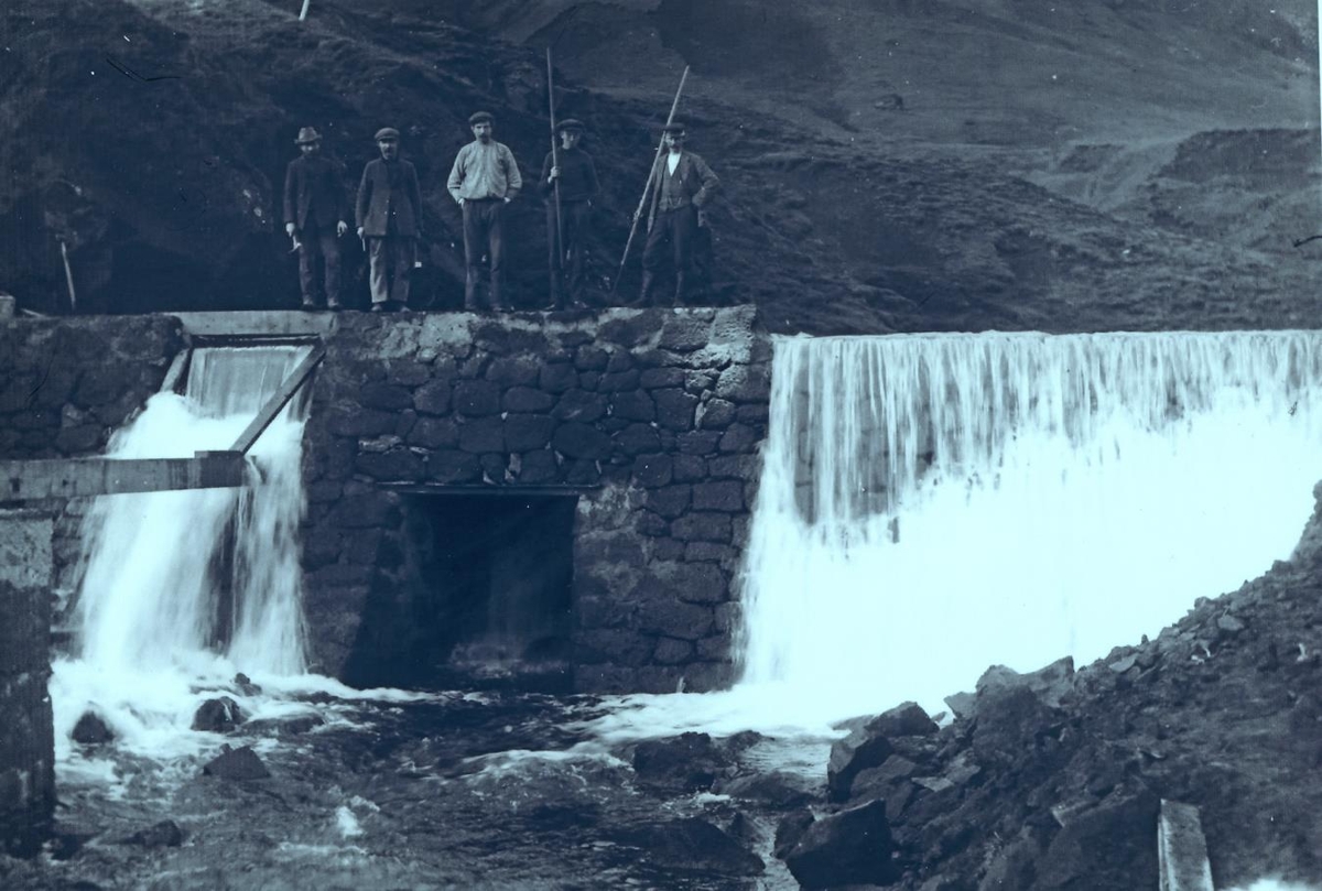 Stíflan við gömlu rafstöðina í Vík í Mýrdal. Frá vinstri eru: Jón Brynjólfsson, Erlendur Björnsson, Eiríkur Ormsson stöðvarstjóri, Jón Ormsson rafvirki og maður ókunnur.