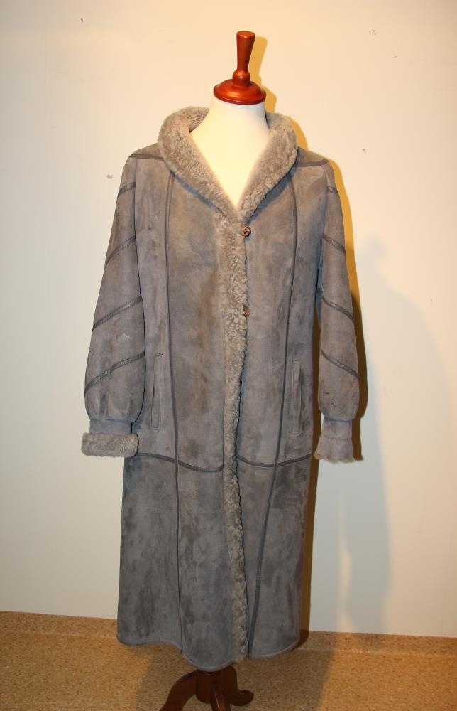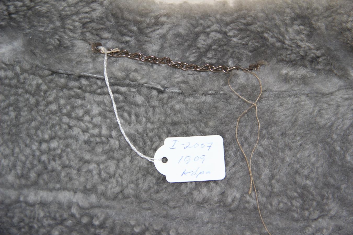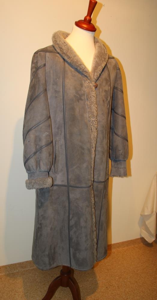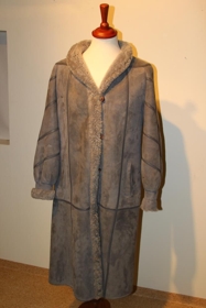 Kápan er úr gráu mokkaskinni með leðurleggingum til skrauts. Texti: Samband of Iceland. Og merki: Vörumerki SÍS. Stærð 44.