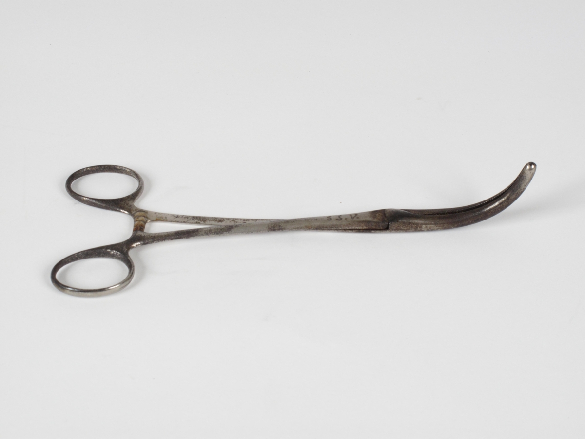 Gray cystic duct forceps without teeth (V Mueller & Co, bls. 391, GO 2382) Krómuð og merkt: COLLIN. Á tangarm er grópað: SSV. Gerð: Aesculap I, B-18174, fig. 2. Arterien und Präparierklemme nach Overholt-Peiszendörfer. Úr eigu Péturs Jakobssonar próf. Sjá: Blöndal/Jónsson I 1970, bls. 646. Gunnlaugur Snædal afhenti.