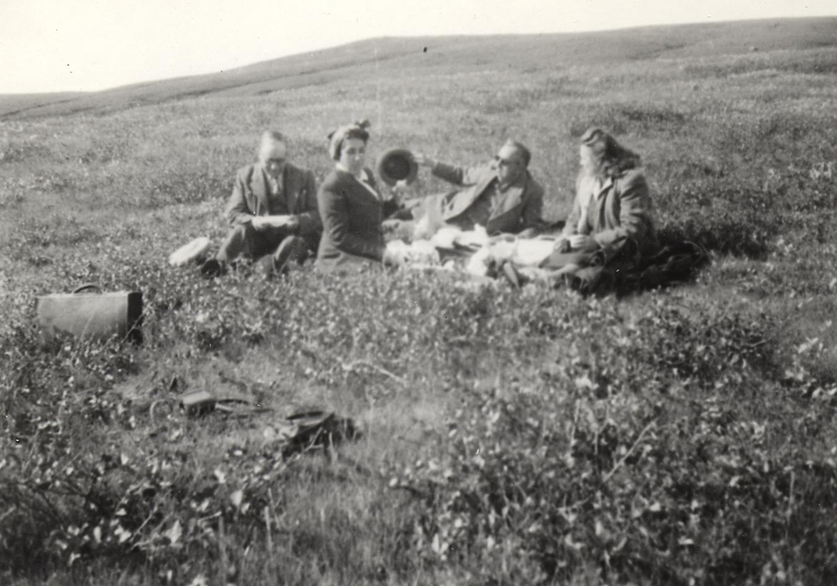 Jónas Jónsson frá Hriflu, Guðrún Stefánsdóttir ásamt óþekktri konu og karlmanni borða nestið sitt úti í náttúrunni.