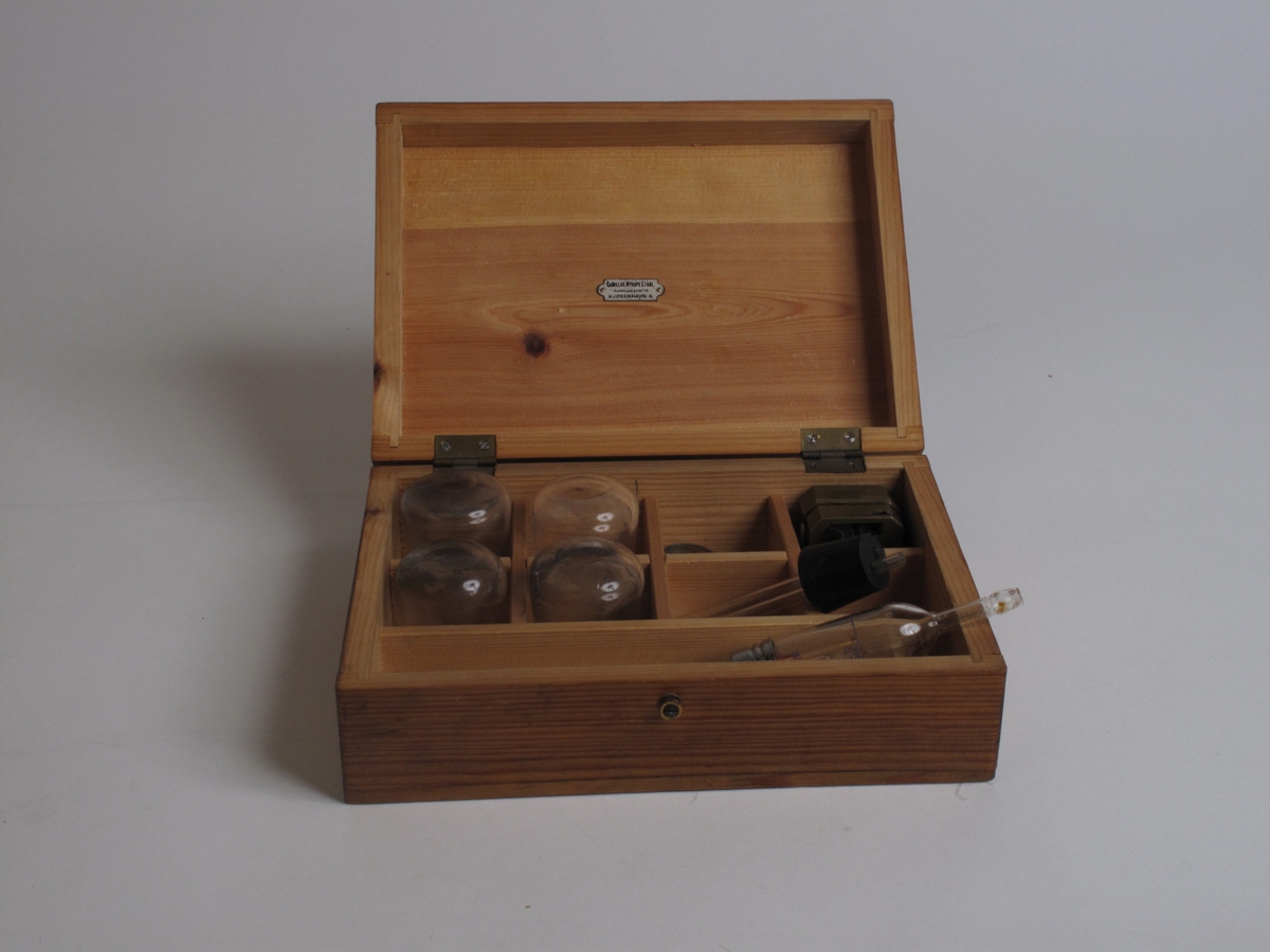 Trékassi, ólitaður, kræktur aftur með einum látúnskrók og með látúnshandfangi. Merki innan á loki: CAMILLUS NYROPS ETABL/KJÖBMAGERGADE 43/KJÖBENHAVN K. Í honum eru 4 glerblóðkoppar en hólf fyrir 8. Áttablaða bíldur (Scarifications apparat) úr látúni. NS-525A. Enn fremur smádót s.s. sprautunálar, sem ekki eru meðal upprunalegs innihalds. Úr eigu próf. Guðmundar Thoroddsen. Gefin Pétri próf. Jakobsyni 18.10.1968 af Skúla lækni Thoroddsen en afhentur Nesstofusafni ásamt NS-525-535 úr skrifborði Péturs próf. Jakobssyni í Lsp. og hann mun hafa ætlað Nesstofusafni 27.03.1975 af dr.med. Gunnlaugi Snædal.