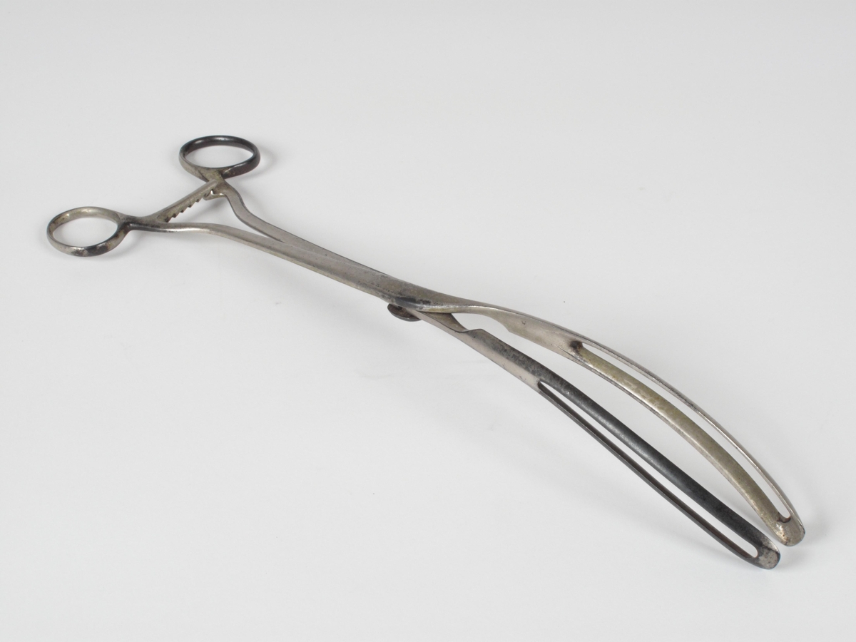 Stór bogin töng með löngu opi á tangarálmu. Úr húðuðum málmi. Hjörur eins og í Nägele's fæðingartöng, Aesculap I, F-6105. Merki: C.NYROP. Er ekki í Aesculap. Úr eigu Péturs Jakobssonar próf. Sjá: Blöndal/Jónsson I 1970, bls. 646. Gunnlaugur Snædal dr.med. afhenti