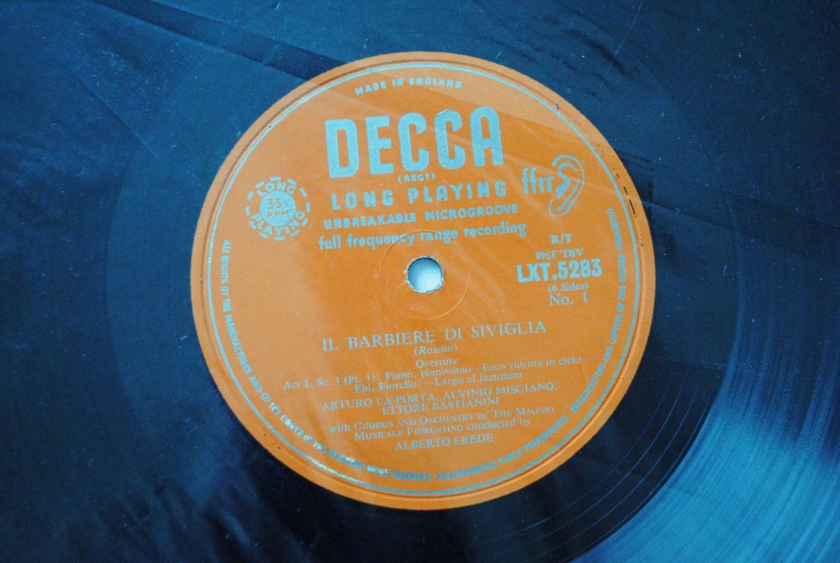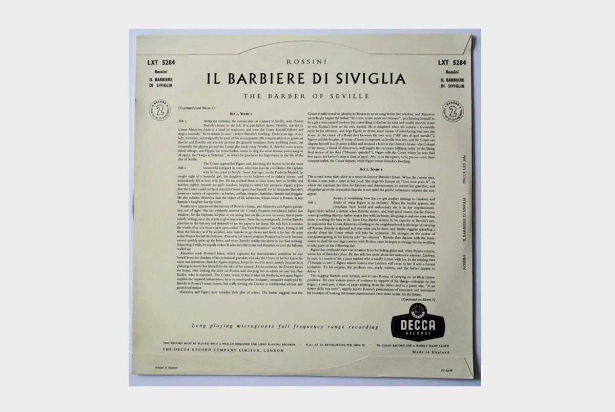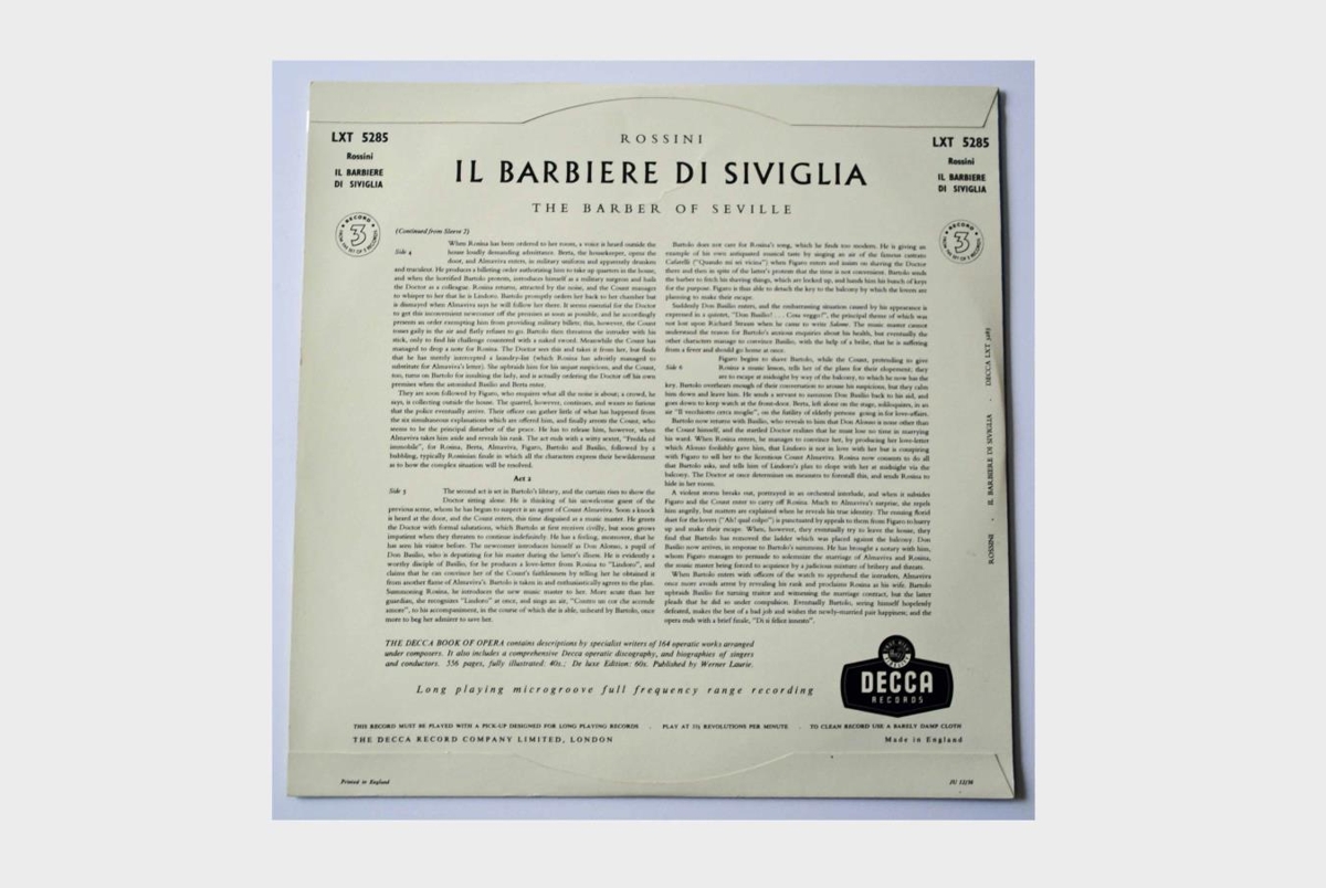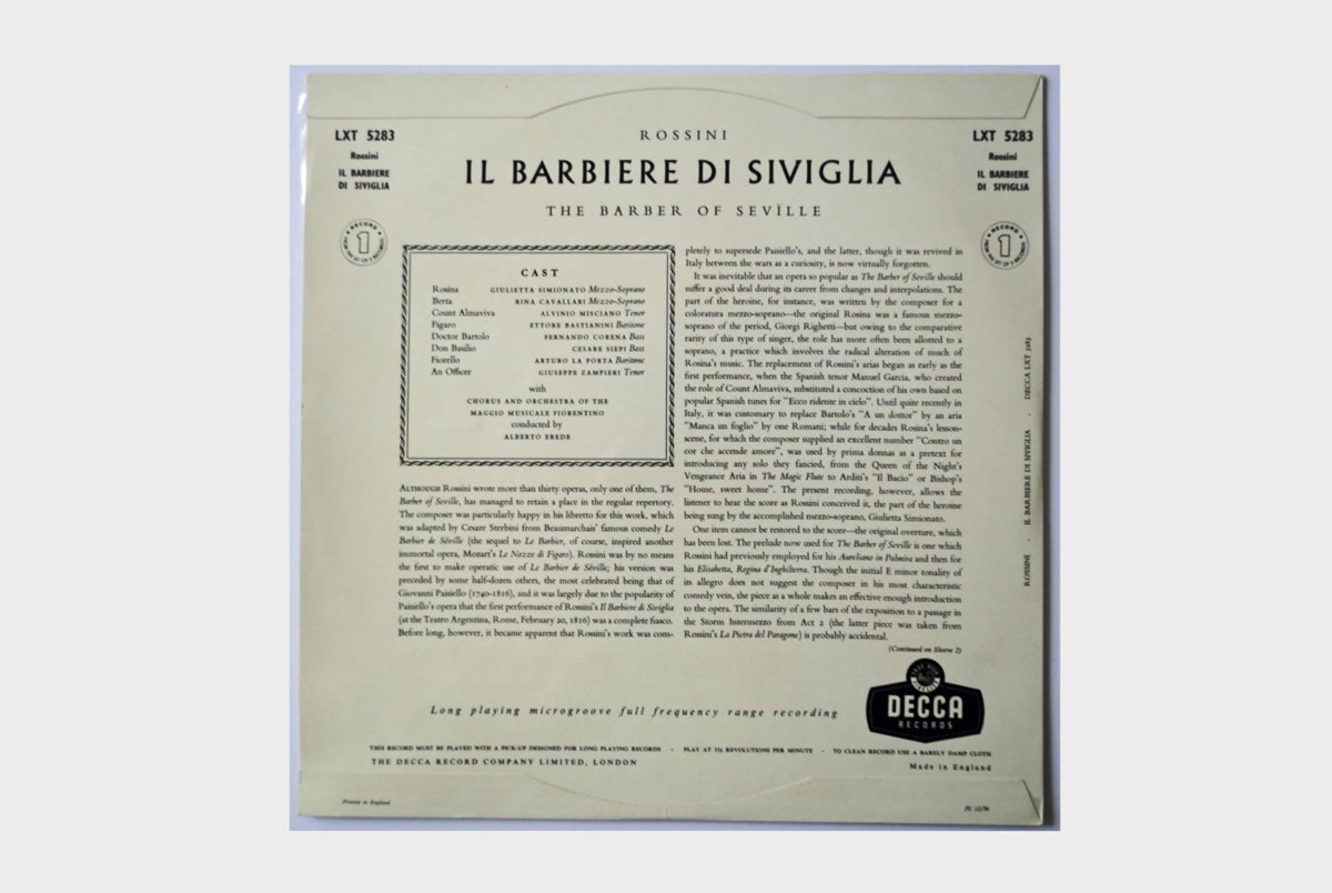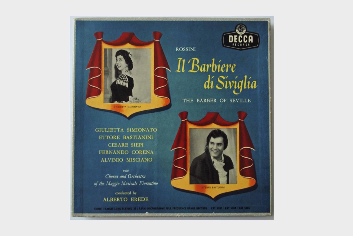 Upptaka af Rakaranum frá Sevilla á þremur 12 tommu hljómplötum. Söngvarar eru: Guilietta Simionato, Ettore Bastianini, Cesare Siepi, Fernando Corena og Alvino Misciano. Kór og hljómsveit Maggio Musicale Fiorentino undir stjórn Alberto Erede.