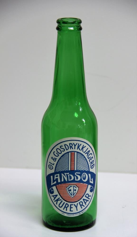 Flaskan er græn með texta í bláum og rauðum lit á merkimiða: Öl og gosdrykkjagerð Akureyrar. Landsól og stafirnir E.E. Flaskan er 6 cm. í þvermál og 22,5 cm. á hæð.