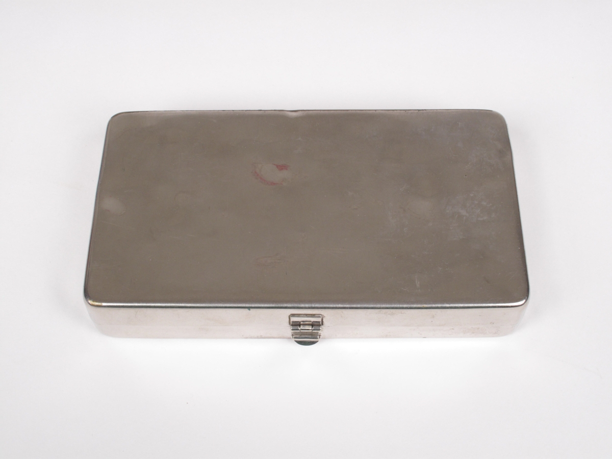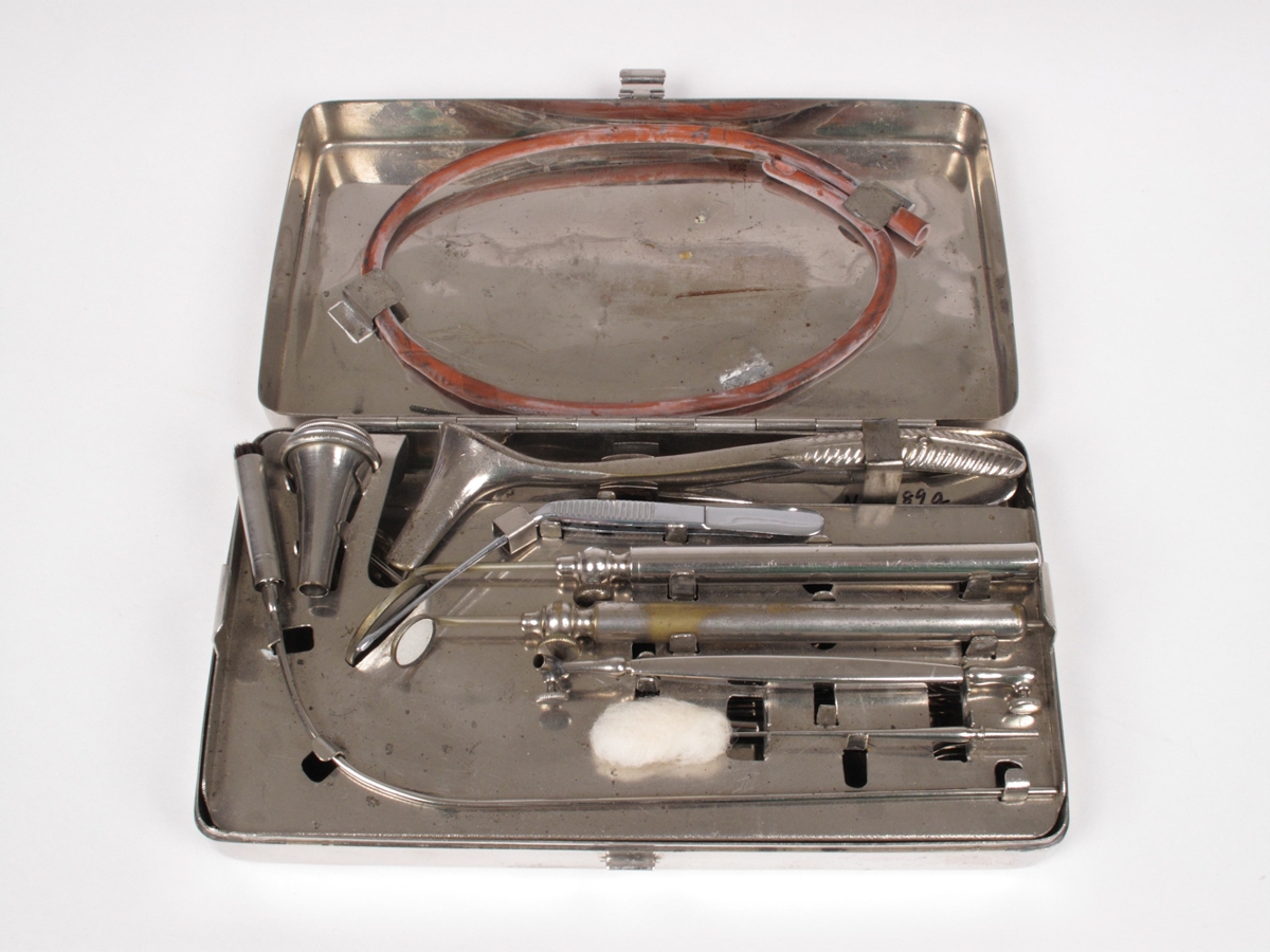 Eyrna-, nef- og hálsskoðunar samstæða. Er í krómuðum málmkassa, ómerktum. Í honum eru nú: a) nef-spevula (gerð A-3790, Vienna model, Mueller & Co). Merkt: HERTEL og er það eina tækið í stokknum sem er merkt. b) Nasal dressing forceps, gerð A-4150. Hartmann (Mueller & co). c) Samstæða 4 eyrnatrekta, gerð C-3015 1/2 Hartemann (Aesculap C). d) Eyrnapinsetta, gerð C-3562, Pollock (Aesculap C). e) Barkakýlisspegill, stærð 4, gerð C 9531, Aesculap C. f) Sama, stærð: 00 g) Hálspensill, gerð C-10445 h) Handfang f. ýmis eyrnatæki, gerð C 4398, Politizer (Aesculap C). i) Nál til að gata hljóðhimnu, k) Bómullar pinni. Í loki kassans er gúmmíkatheter, og 2 tæki mun vanta í hann. Úr eigu Gunnlaugs Einarssonar læknis (1892-1944). Afhentir af Gunnlaugi Snædal 30.05.1984.