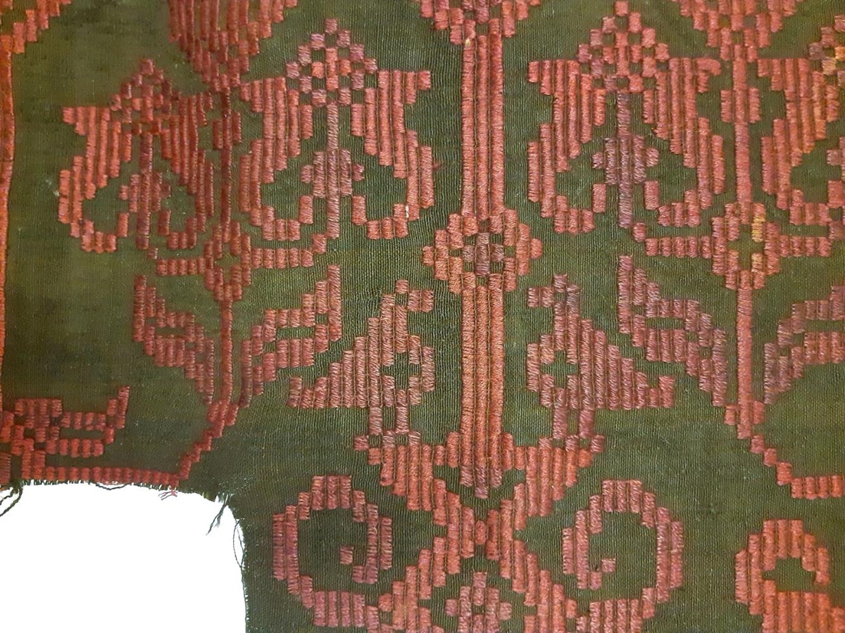 Bútur úr söðuláklæði sem er ofið úr handspunnu togi. Grunnur er svartur en ívafið er vínrautt, trúlega litað með krapprót. Salúnsvefnaður. Úr einu horninu er skorið eða klippt úr efninu, 27x38 cm. Klæðisbútar eru hafðir undir á tveimur stöðum.