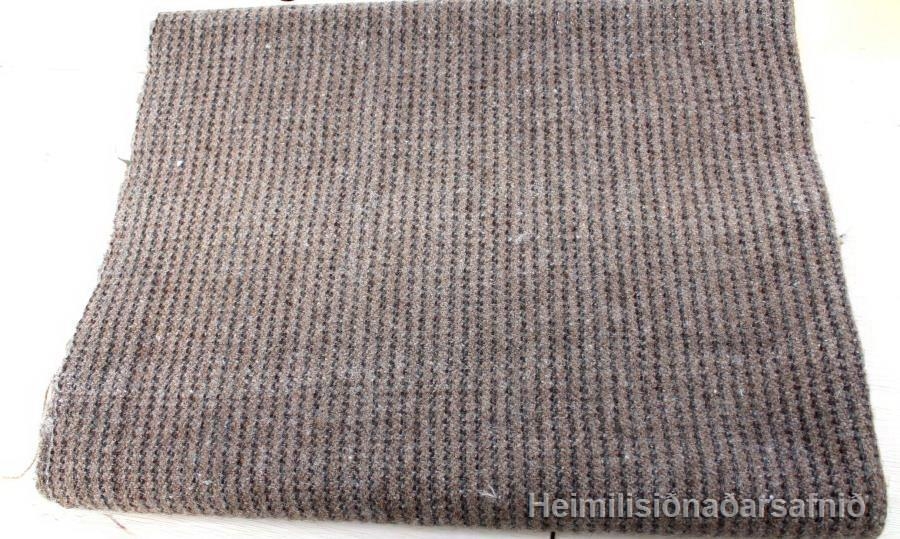 Vaðmál - bútur 112X135 CM. efni í buxur - uppistaða er mórauð og sauðsvart og ívafið gráir litir. Ofið 1930, unnið af Rakel og Guðlaugi á Þverá.