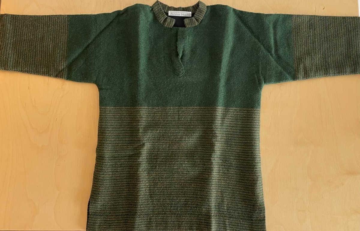 Saga: Anna Halla, sem saumaði mussuna, var fædd á Siglufirði 5. Apríl 1947. Hún lést á líknardeild Landspítalans þann 27. Sept. 2010. Anna ólst upp á Sauðákróki og Hólmavík. Hún tók landspróf frá Héraðsskólanum að Reykjum árið 1962 og stúdentspróf frá Menntaskólanum á Laugarvatni árið 1966. Forpróf í málvísindum og hljóðfræði frá HÍ 1968. Nam vefnað við Statens Håndverk og kunstindustriskolen í Ósló 1969-1973 með diplom í vefnaði og kennarapróf í handmennt frá Statens Lærerskole í Forming, Notedden, Noregi 1977. Hún starfaði um skeið á eigin vefstofu í Osló. Eftir að hún flutti til Íslands starfaði hún sem handmenntakennari við Valhúsaskóla á Seltjarnarnesi um nokkurra ára skeið og síðan í nokkur ár hjá Frímerkjasölu Pósts og síma. Síðan hóf hún störf við handritadeild Þjóðarbókhlöðunnar og starfaði þar til dauðadags. Eftir Önnu Höllu liggur töluvert af vefnaði og öðrum verkum sem bera vitin um einstaka vandvirkni hennar og smekkvísi. Hún tók þátt í samsýningum veflistamanna eftir heimkomuna frá Noregi og var virkur félagi í samtökum þeirra. Hún óf veggteppi sem óskað var eftir að hún ynni fyrir safnaðarheimili Árbæjarsóknar og safnaðarheimilið í Vestmannaeyjum og fyrir sjúkrahúsið Akranesi. Töluvert af vefnaði Önnu Höllu er til í eigu ættingja og vina hennar. Anna Halla Björgvinsdóttir (1947-2010)