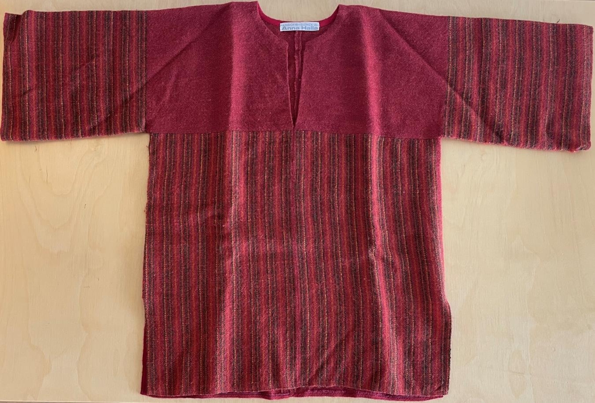 Saga: Anna Halla, sem saumaði mussuna, var fædd á Siglufirði 5. Apríl 1947. Hún lést á líknardeild Landspítalans þann 27. Sept. 2010. Anna ólst upp á Sauðákróki og Hólmavík. Hún tók landspróf frá Héraðsskólanum að Reykjum árið 1962 og stúdentspróf frá Menntaskólanum á Laugarvatni árið 1966. Forpróf í málvísindum og hljóðfræði frá HÍ 1968. Nam vefnað við Statens Håndverk og kunstindustriskolen í Ósló 1969-1973 með diplom í vefnaði og kennarapróf í handmennt frá Statens Lærerskole í Forming, Notedden, Noregi 1977. Hún starfaði um skeið á eigin vefstofu í Osló. Eftir að hún flutti til Íslands starfaði hún sem handmenntakennari við Valhúsaskóla á Seltjarnarnesi um nokkurra ára skeið og síðan í nokkur ár hjá Frímerkjasölu Pósts og síma. Síðan hóf hún störf við handritadeild Þjóðarbókhlöðunnar og starfaði þar til dauðadags. Eftir Önnu Höllu liggur töluvert af vefnaði og öðrum verkum sem bera vitin um einstaka vandvirkni hennar og smekkvísi. Hún tók þátt í samsýningum veflistamanna eftir heimkomuna frá Noregi og var virkur félagi í samtökum þeirra. Hún óf veggteppi sem óskað var eftir að hún ynni fyrir safnaðarheimili Árbæjarsóknar og safnaðarheimilið í Vestmannaeyjum og fyrir sjúkrahúsið Akranesi. Töluvert af vefnaði Önnu Höllu er til í eigu ættingja og vina hennar. Anna Halla Björgvinsdóttir (1947-2010)