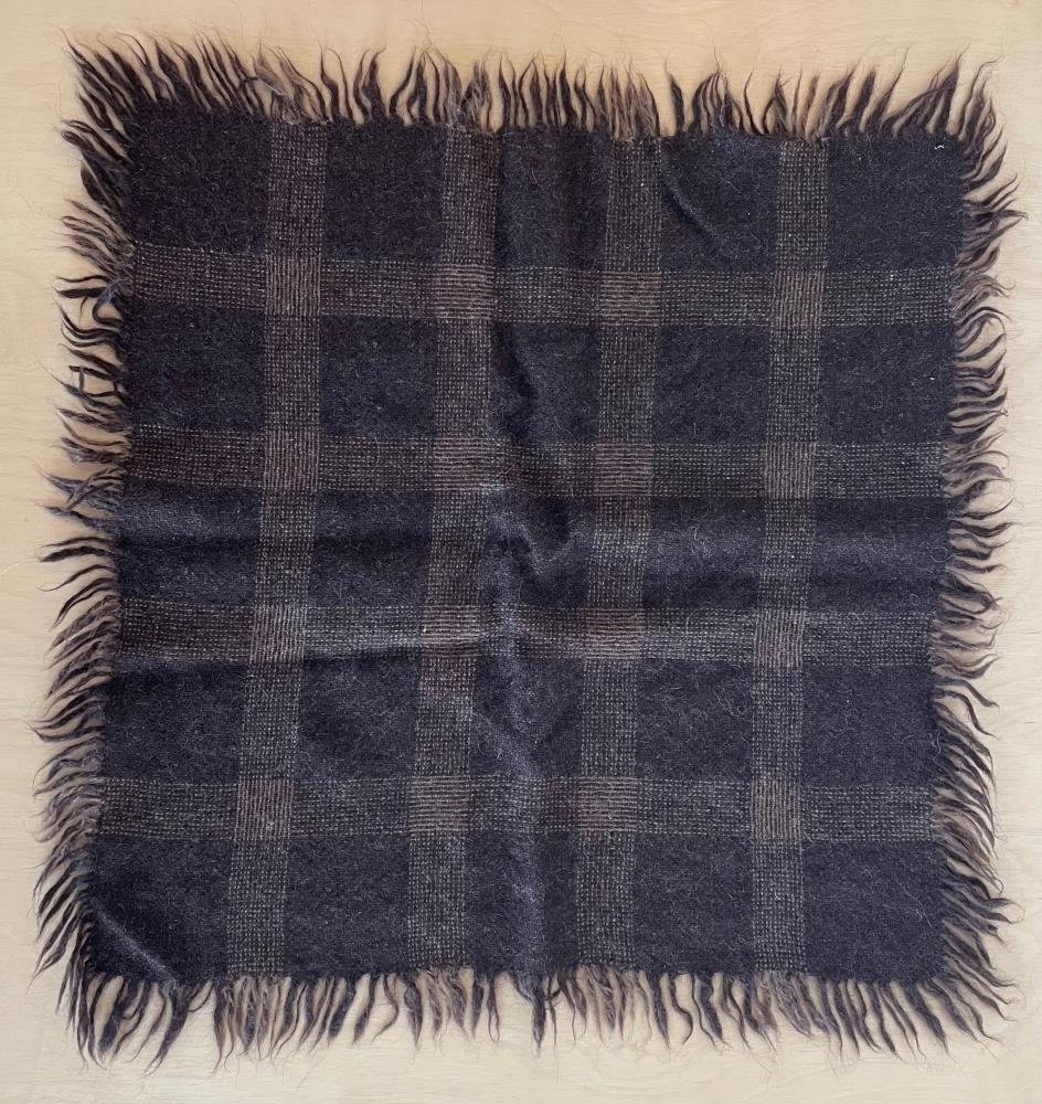 Skýluklútur - Ofinn úr dökkmórrauðu grunnlit í ull. Ofnir eru reitir í ljósmórrauðu. Kögur .