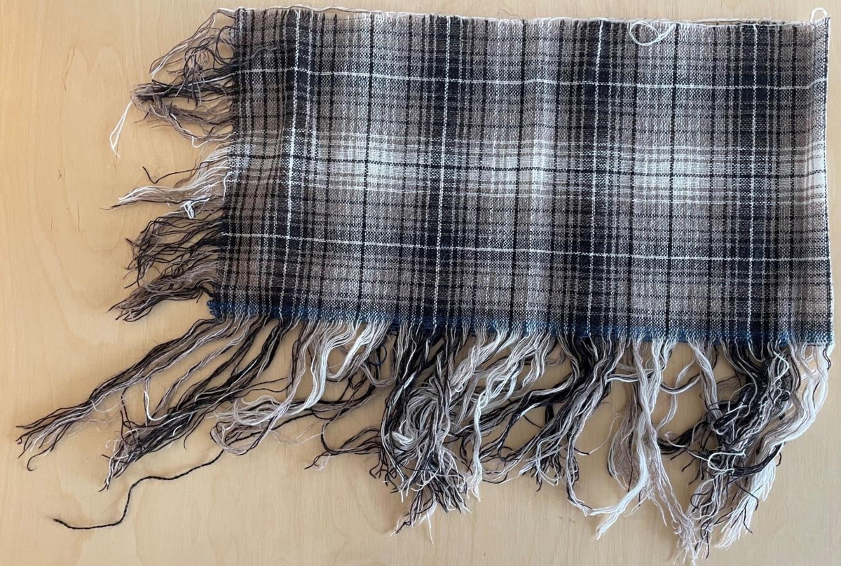 Prufa - Ofið úr ullarbandi í nokkrum mórrauðum litum og einum hvítum. Einni er einn blár litur. Mikið kögur á þrjár hliðar