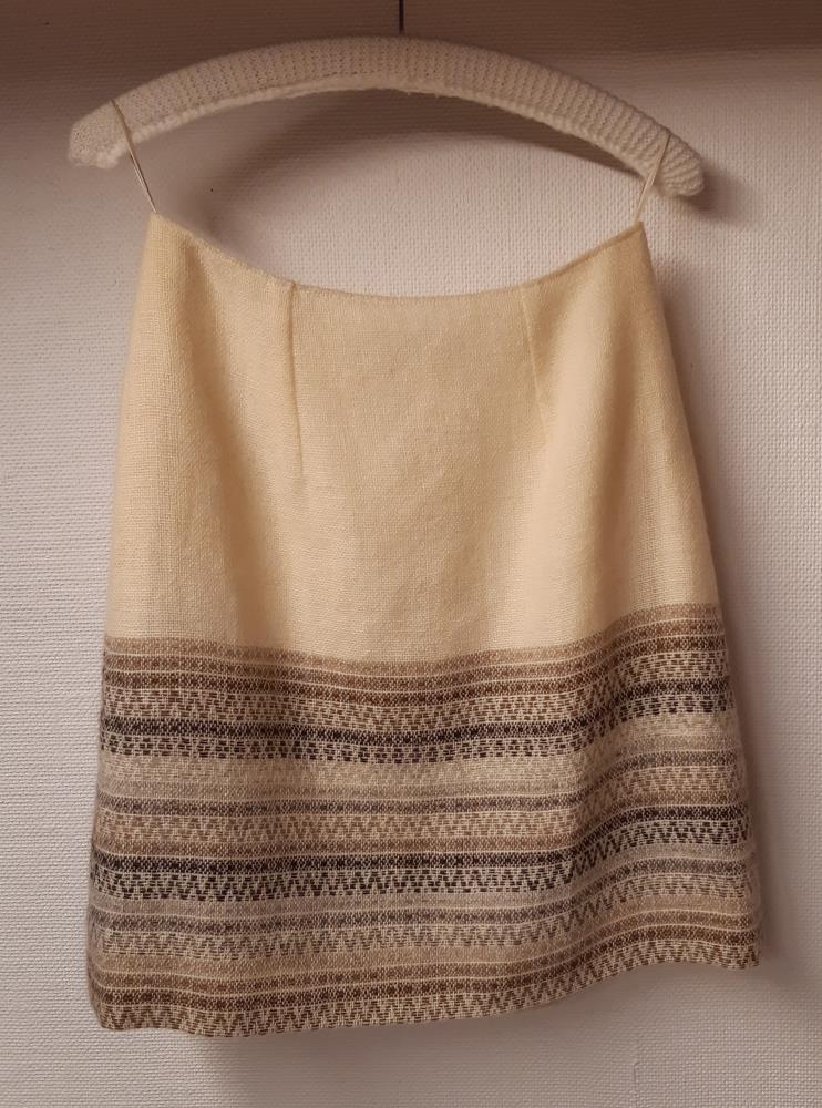Pils a - Pilsið er hvítt með brúnum rósabandsvefnaði. Við pilsið er slá nr. 2436 b.