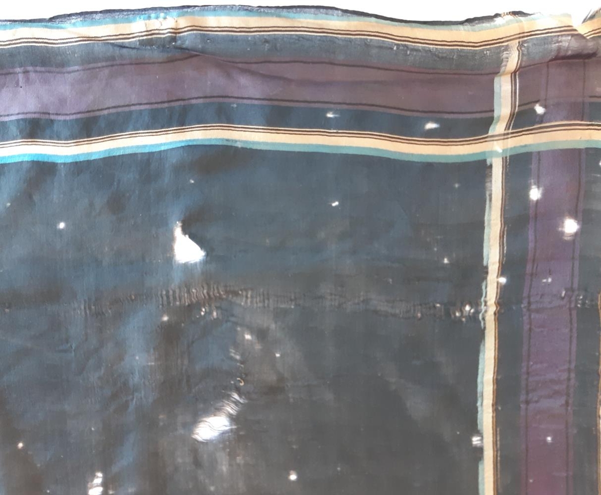 Silkiklútur. Aðallitur er svartur. Í röndum eru blágrænn, gulur, brúnn og fjólublár. Í klútnum er ekta silki.