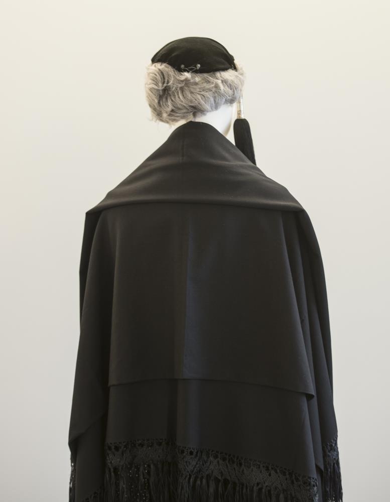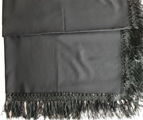 Peysufatasjal Ingibjargar Pálsdóttur. Sjalið er svart með silkikögri sem er 15 cm breitt allt um kring.