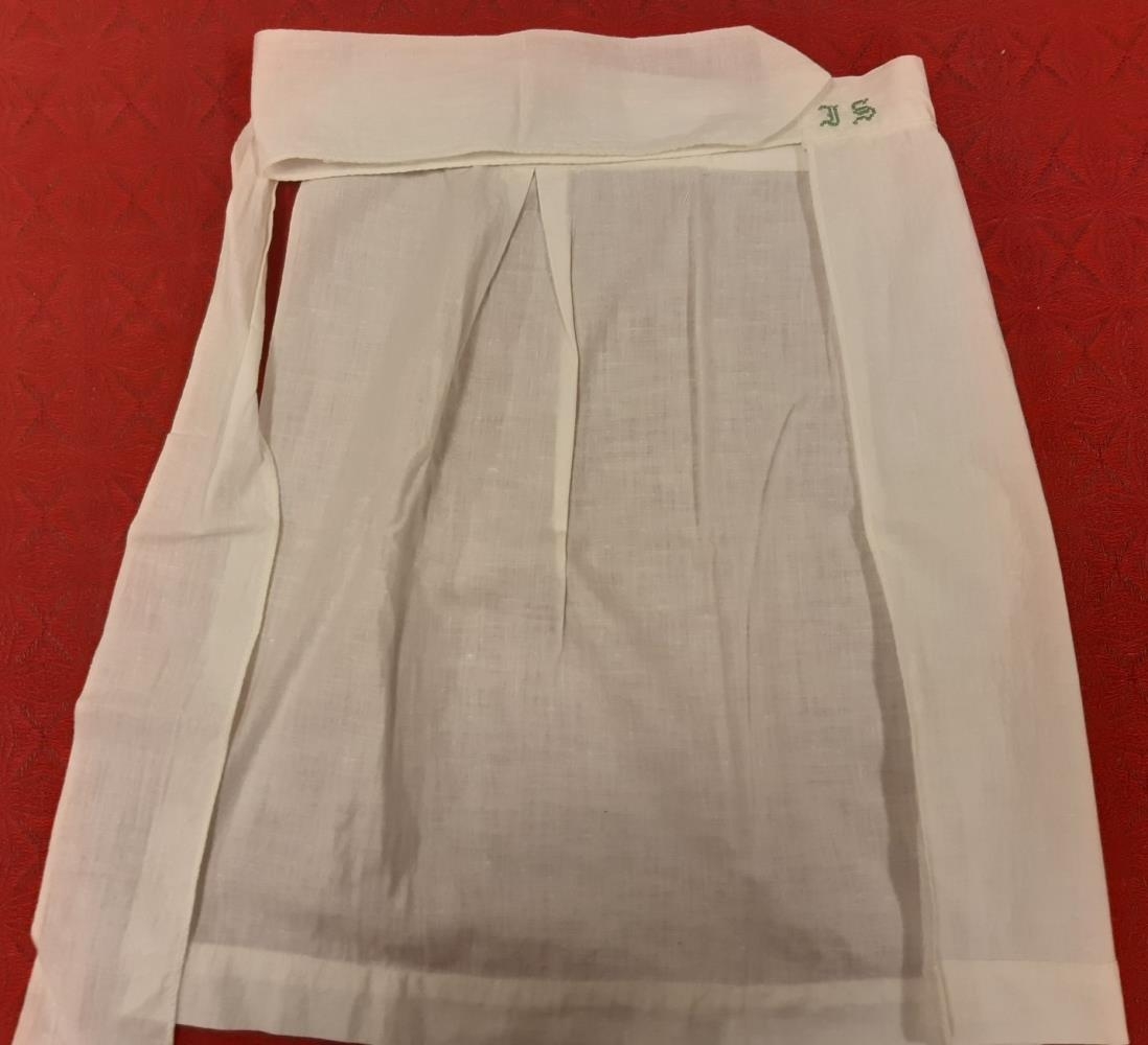 Svunta úr hvítu þunnu lérefti. Hægra megin innan á streng er saumað með krosssaumi í grænu 'IS'.